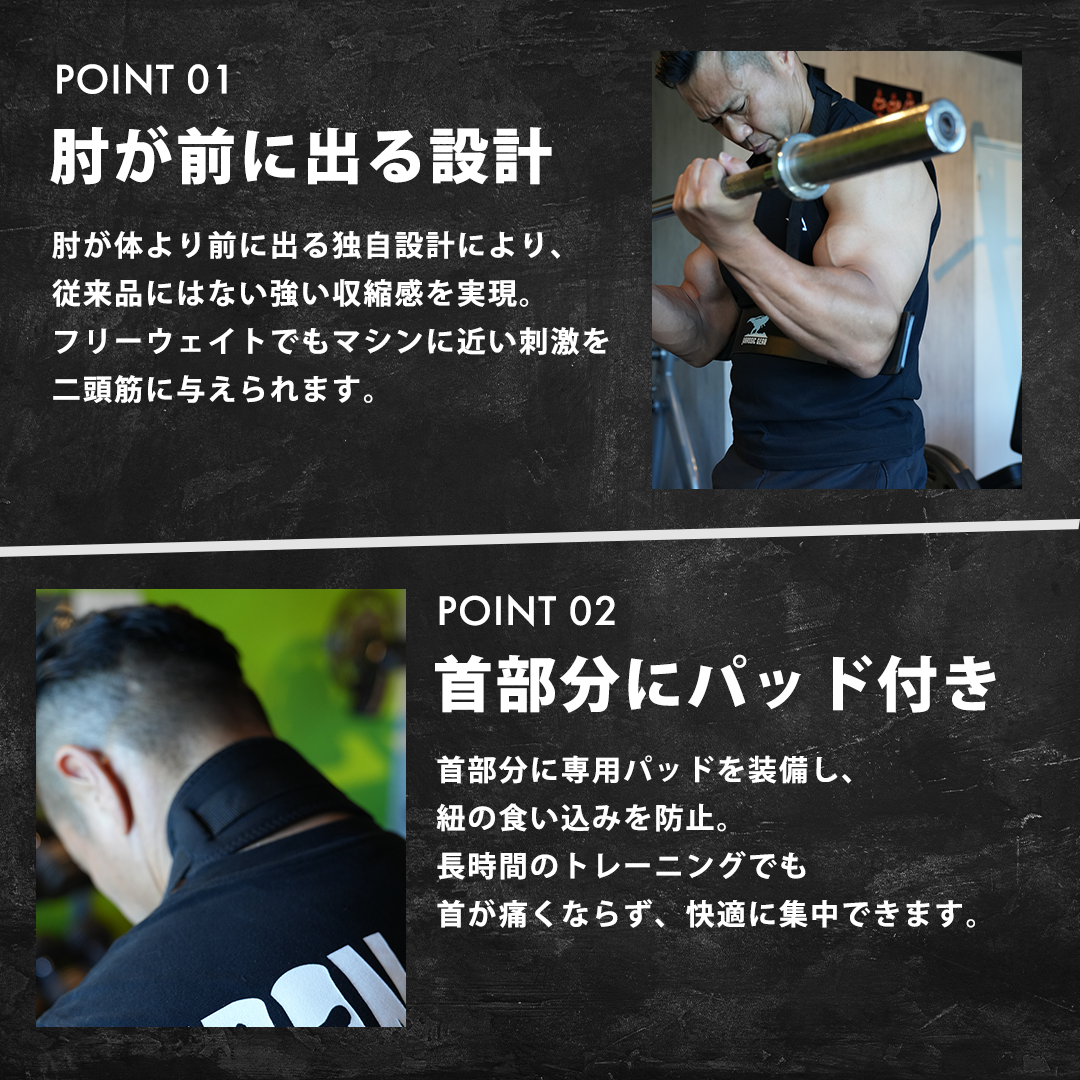 従来品では得られない強い収縮感を追求。肘が体より前方に出る独自設計により、フリーウェイトでもマシンに近い刺激を二頭筋に与えます。