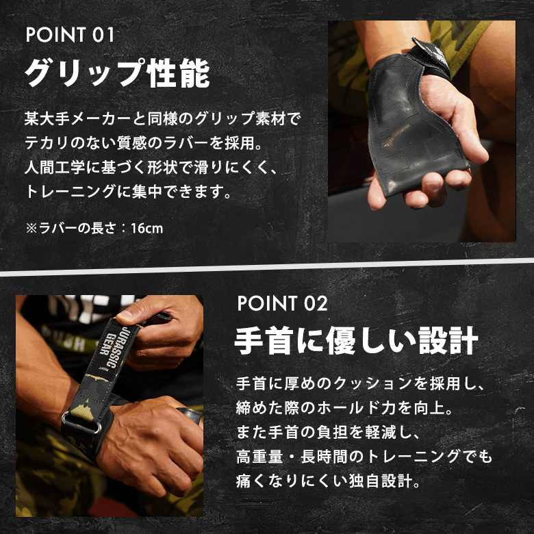 手首の負担を軽減し、高重量・長時間のトレーニングでも痛くなりにくい独自設計にしました!
