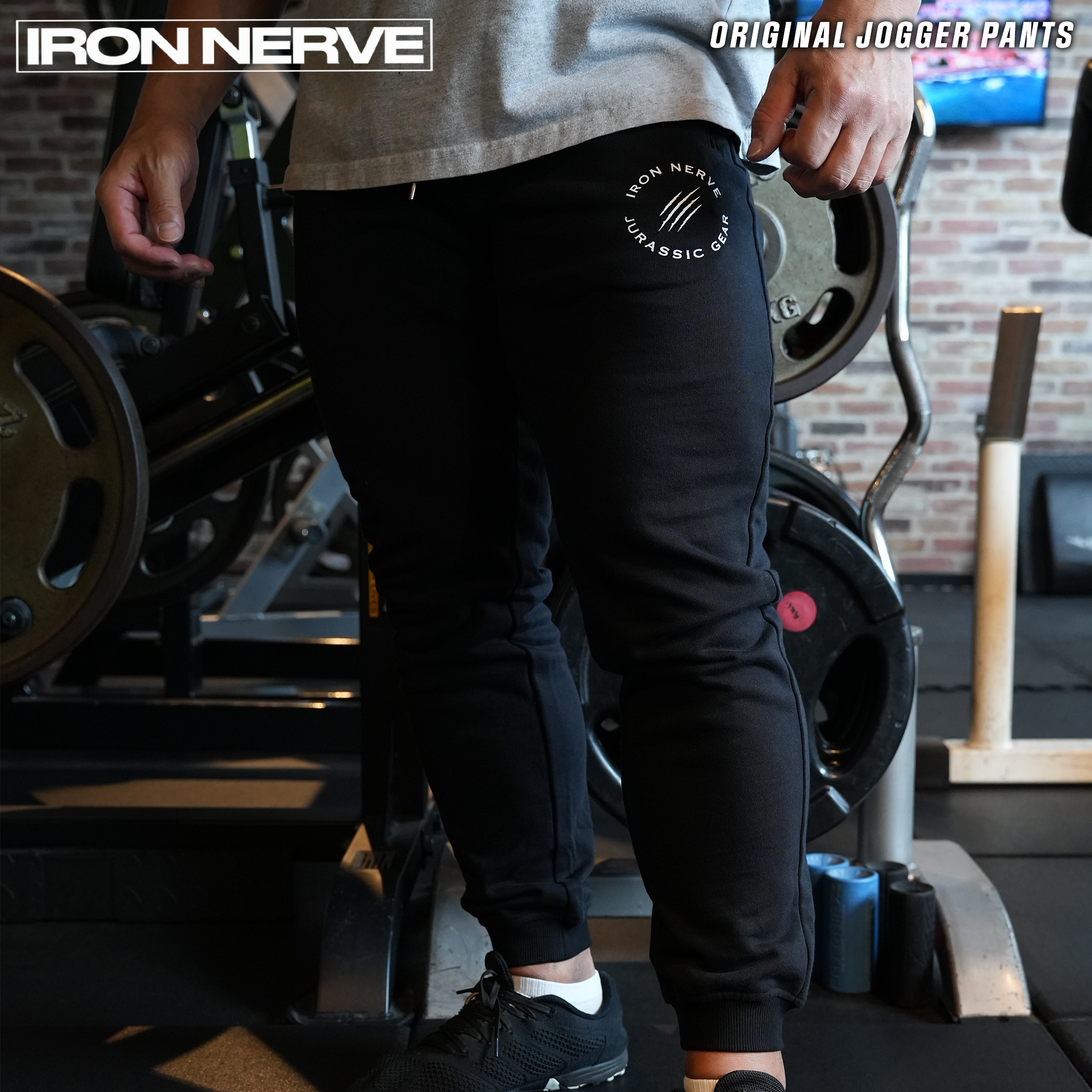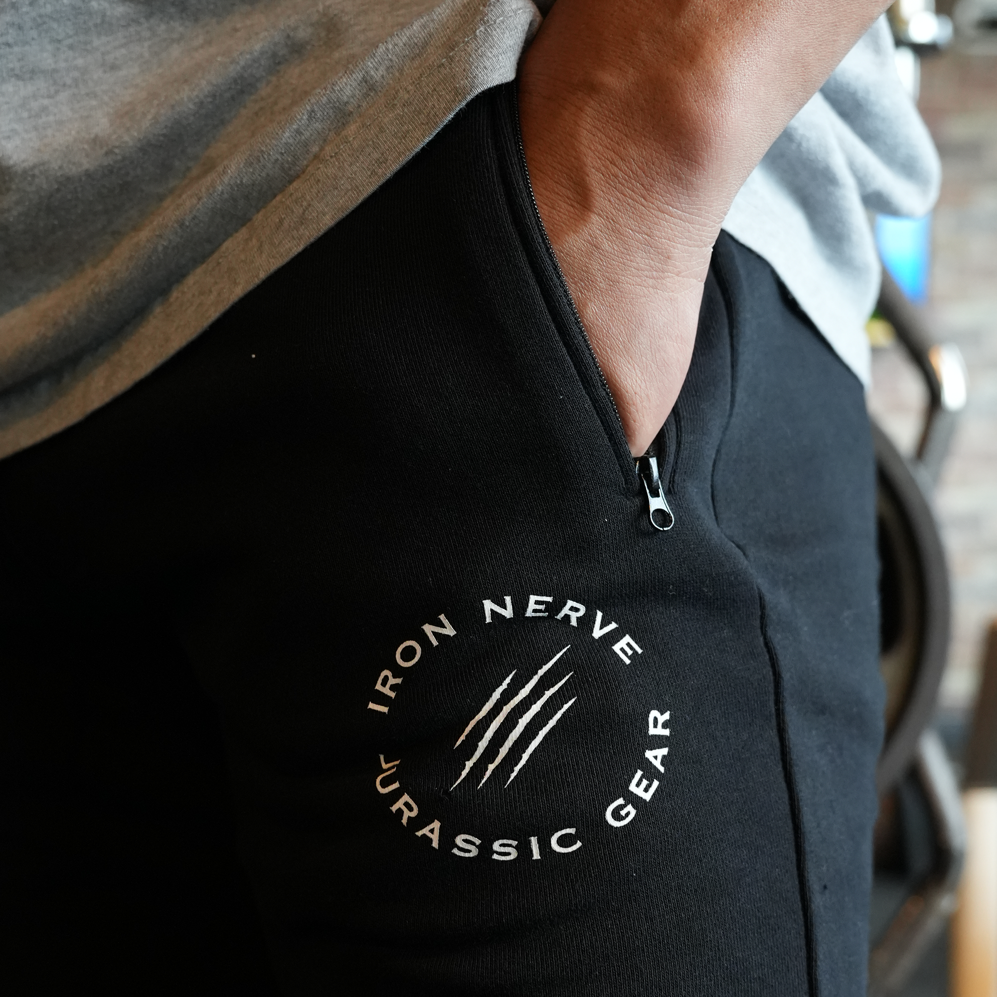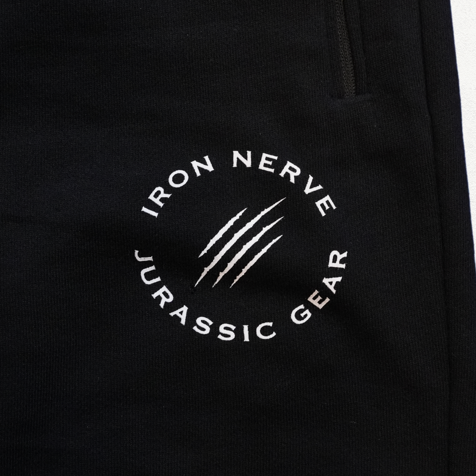 左ももに配置された〈IRON NERVE × JURASSIC GEAR〉の新しいロゴ。シンプルながらも存在感のあるデザインは、日常でもトレーニングでも自然に馴染みます。