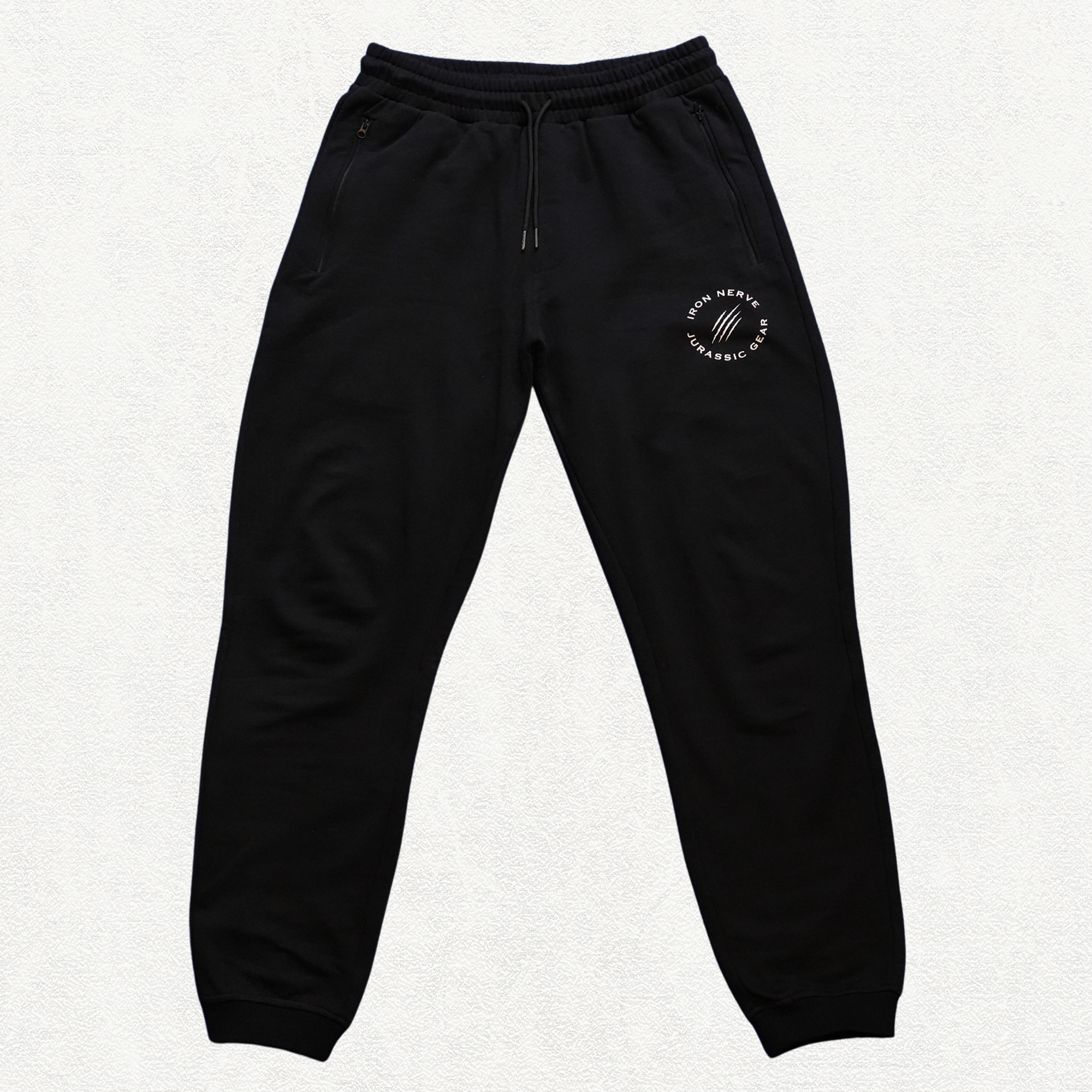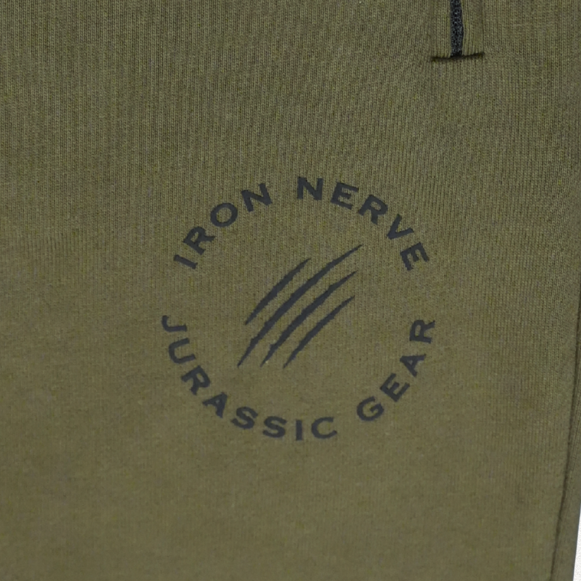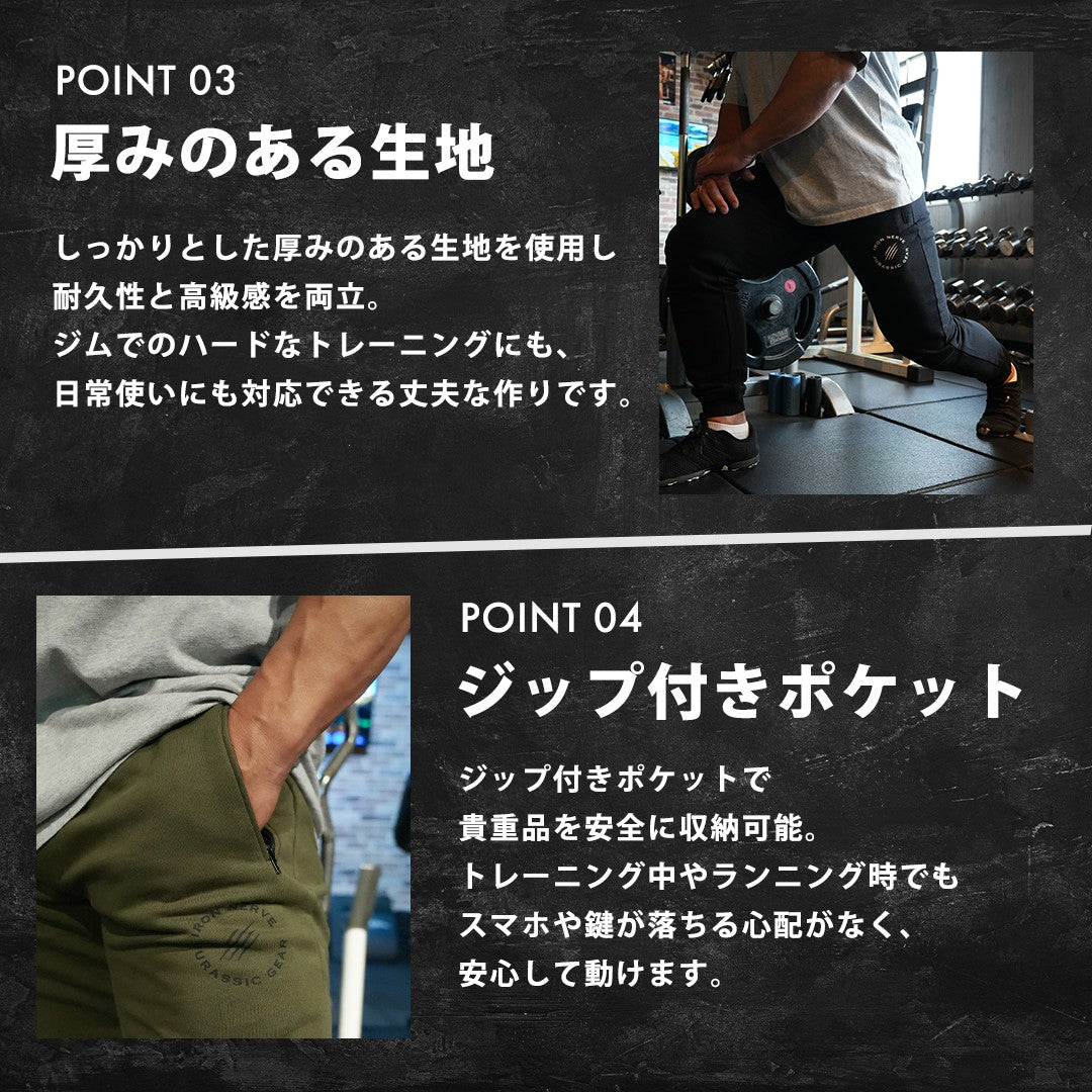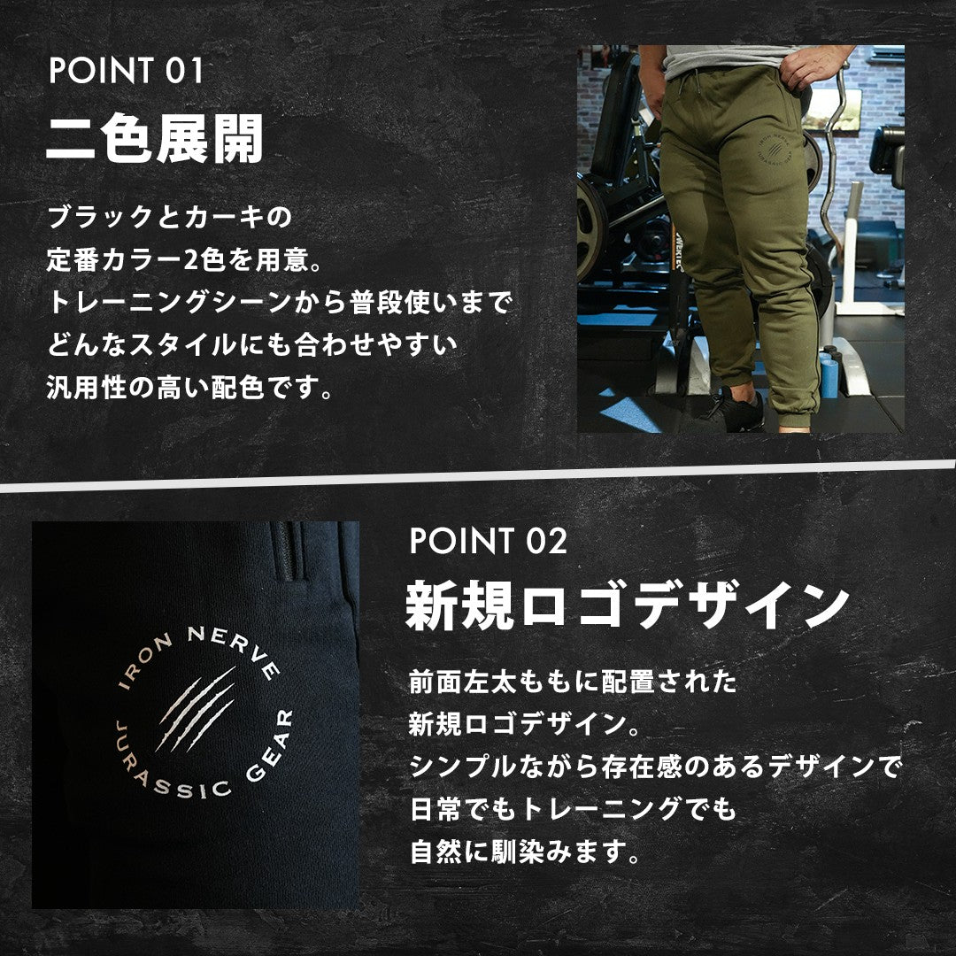 左ももに配置された〈IRON NERVE × JURASSIC GEAR〉の新しいロゴ。シンプルながらも存在感のあるデザインは、日常でもトレーニングでも自然に馴染みます。